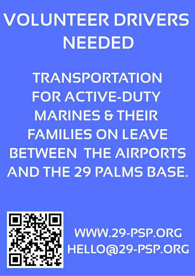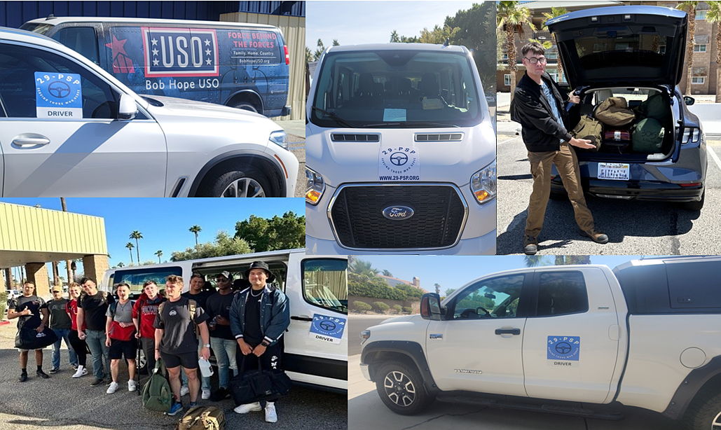 29-PSP is a non-profit that started operating on May 24, 2024 after the SOSRide organization discontinued service at the end of 2023. A few of the SOS Ride volunteers created 29-PSP to continue providing complimentary transportation ($200 savings) for active military and their loved ones on leave between the Twentynine Palms Marine base and the Palm Springs & Ontario International Airports. To keep expenses low, 29-PSP is a 100% volunteer organization. All funds raised are used to pay for operational expenses, insurance and providing rides for Marines and their loved ones.